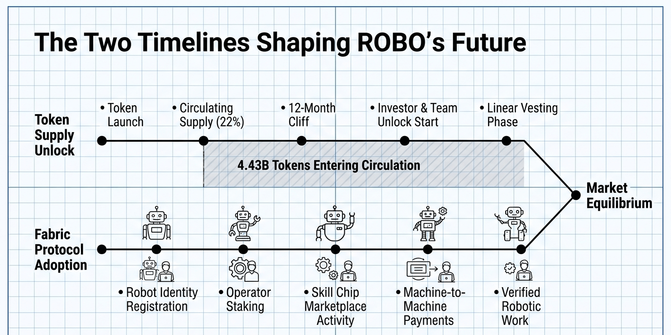 What actually deserves attention is a race that's already started — quietly, without much discussion — between two timelines that will determine what ROBO is worth when they finally collide. One is the vesting schedule. The other is Fabric Protocol's real-world adoption curve. The gap between them is the only number that matters right now, and almost nobody is modeling it seriously.