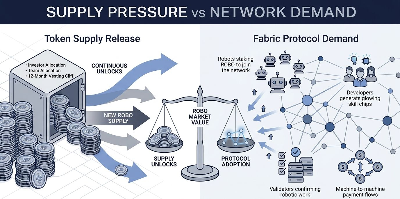 That layered supply dynamic is something Fabric Protocol's design created intentionally. The Fabric Foundation understood that infrastructure tokens don't work if the only demand is speculative. Proof-of-Robotic-Work forces real skin in the game from real participants. But it only functions as a counterweight to vesting pressure if the network is generating enough verified work to matter.