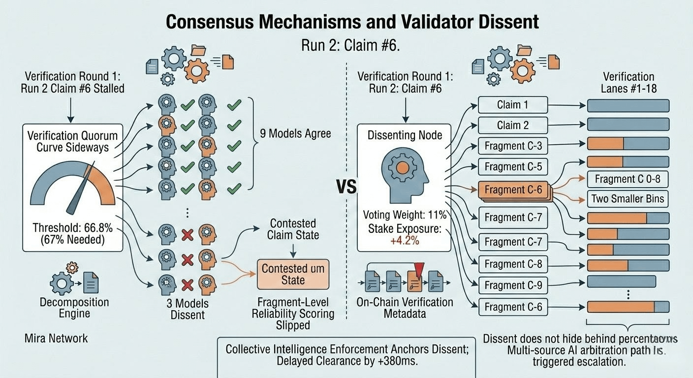 By the time I opened the second validator trace, the supermajority line on the first fragment was already moving. One validator aligned. Then another. No widened branch. No secondary dataset revision dragged into the round. Just a tidy reading getting certified because it was easier to certify.