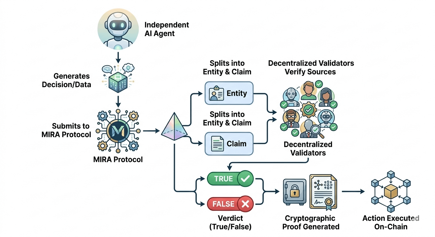 Autonomous AI agents ka concept sunne mein bahut sexy lagta hai Bina driver ki gaadi, aur bina malik ki kamai! Par reality thodi complex hai. Aaj ke AI models, chahe wo kitne bhi advanced kyon na hon, hallucinations aur biases se grast hain. Agar ek AI agent ko independent chhod diya jaye, toh ho sakta hai wo kisi galat data pool se influence hokar apka saara fund liquidate kar de. Centralized companies jaise OpenAI ya Google humein verification ka koi transparent tarika nahi dete. Unka logic ek black box mein band hai. Isliye, trustworthy independence achieve karne ke liye humein ek decentralized protocol chahiye jo AI ke har step ko verify kare on chain. MIRA exactly yahi gap fill karta hai. White paper ke mutabik, MIRA ek aisa trust layer banata hai jahan AI agents ko apni intelligence prove karni padti hai before it is accepted by the network.