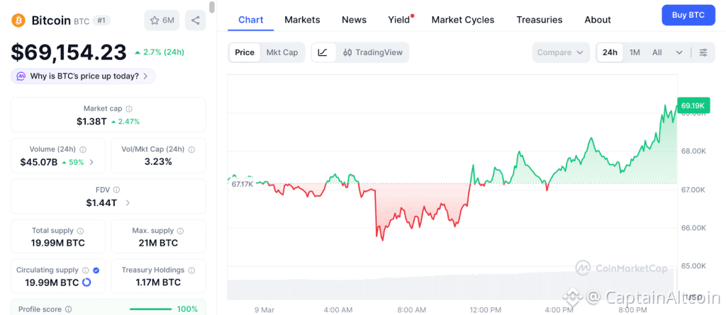 Bitcoin holds above $69,000 as the entire market bounces back with volume surging 53%, and MicroStrategy just proved why the smart money never stops buying during fear. Strategy, the company Michael Saylor built into the largest corporate Bitcoin holder on earth, bought 3,015 more BTC for $204 million at $67,700 each, bringing total holdings to 720,737 Bitcoin worth roughly $48 billion.