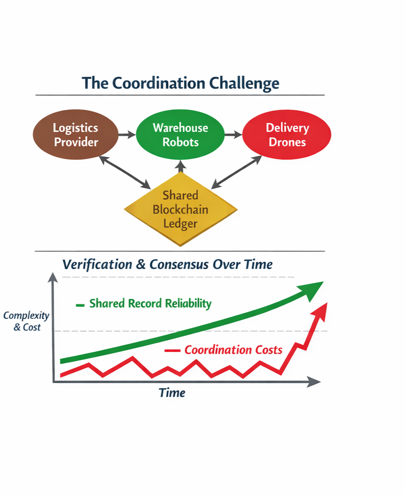 Underneath, they require a neutral system that confirms what each machine actually did. Without that confirmation layer, coordination becomes fragile. One missed update in a logistics system can disrupt inventory forecasts or delivery schedules.
