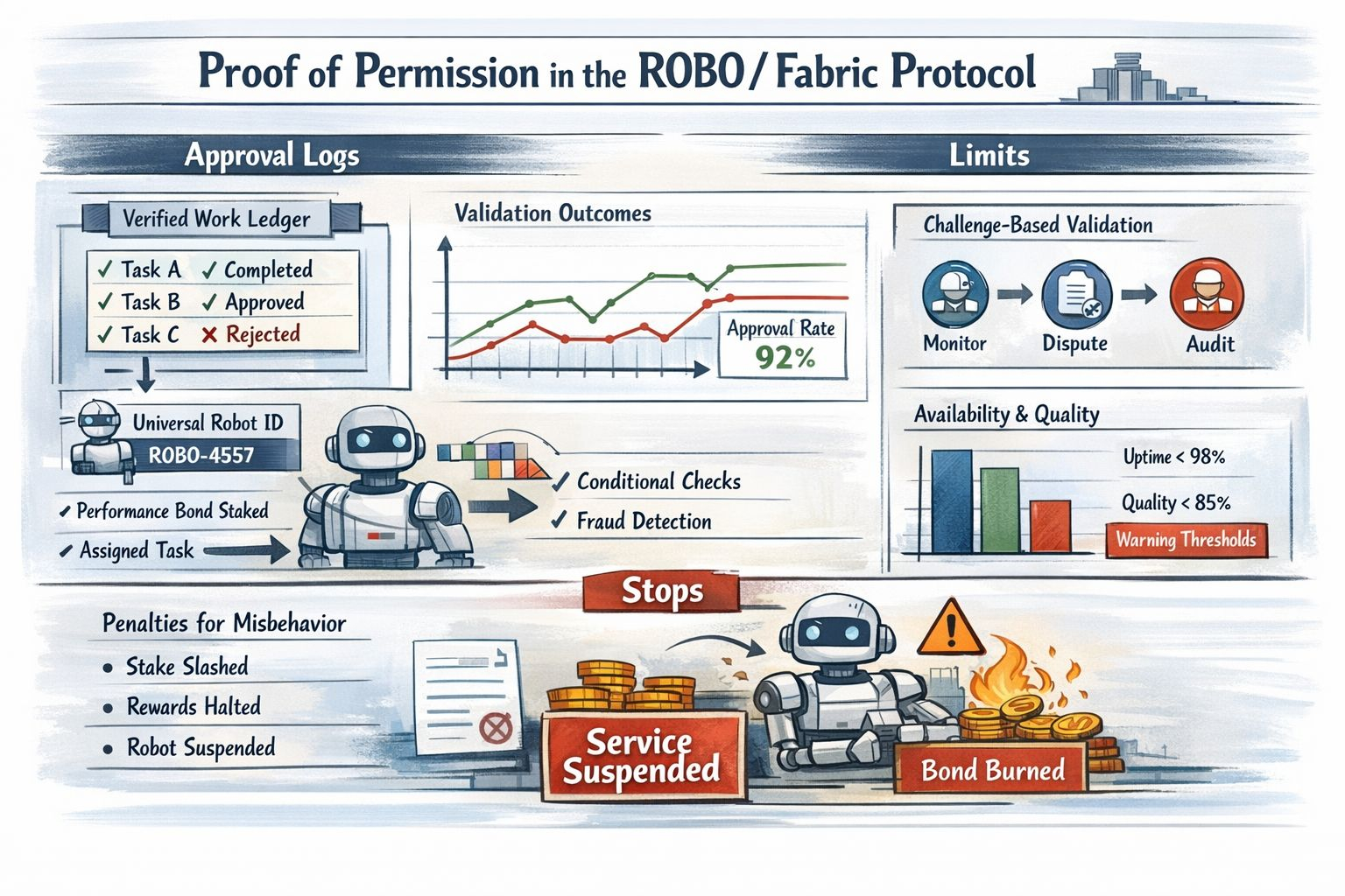 The stops are even clearer. If a robot submits fraudulent work then a significant share of the earmarked task stake can be slashed and the robot is suspended until it re-bonds. If availability drops below ninety eight percent over a thirty day epoch then the robot loses emission rewards for that period and part of the bond is burned. If the aggregated quality score falls below eighty five percent then reward eligibility is suspended until the operator fixes the problem. Those are not decorative warnings. They are actual stopping points built into the economic design and they make the title of this topic feel justified to me because stops are where permission becomes enforceable rather than symbolic.