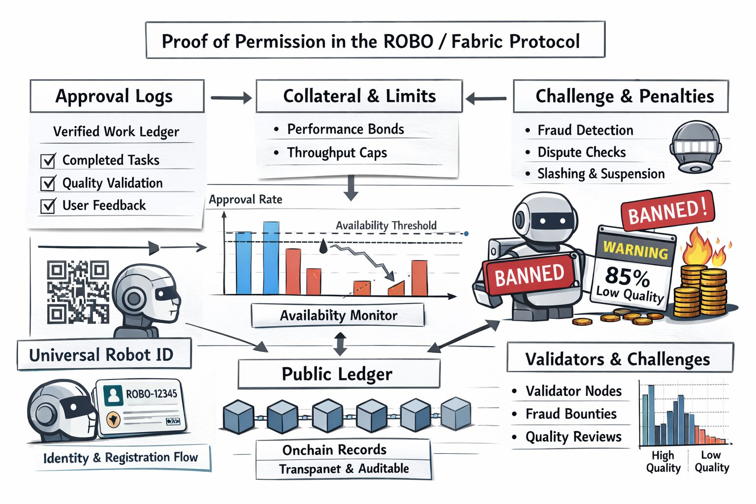 That is why proof of permission matters to me in the ROBO and Fabric conversation. I have not found an official Fabric section that uses that exact phrase but I do see a set of mechanisms trying to answer the same question more strictly than most robotics projects do. Fabric describes public ledgers and onchain identity along with verified work validator checks and penalty rules. In plain terms I read that as an effort to leave evidence behind before during and after a machine acts instead of asking me to trust a company dashboard later.
