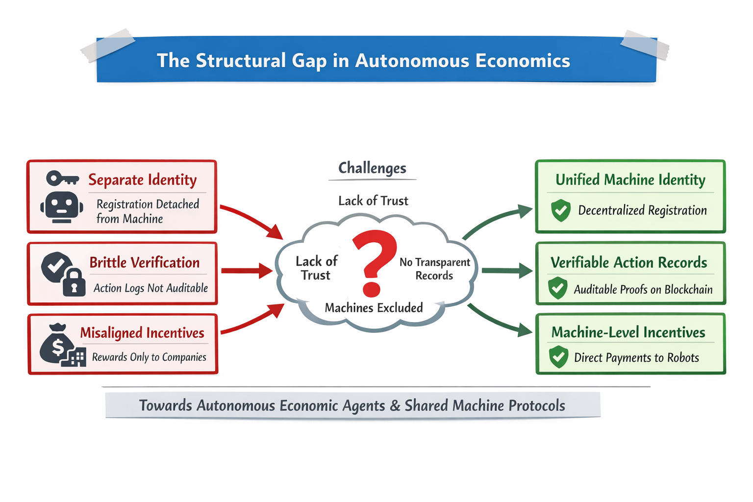 The problem has several facets. First registration and identity are separate from the physical machine. That separation leaves a gap when coordination or trust is needed across organizations. Second verification of actions is brittle. A single operator can claim an outcome and that claim is hard to test without independent evidence. Third incentives are misaligned. If the economic reward is only payable to firms then there is little basis for machines to participate as autonomous economic agents or for communities to build shared protocols that rely on machine level staking or reputation.