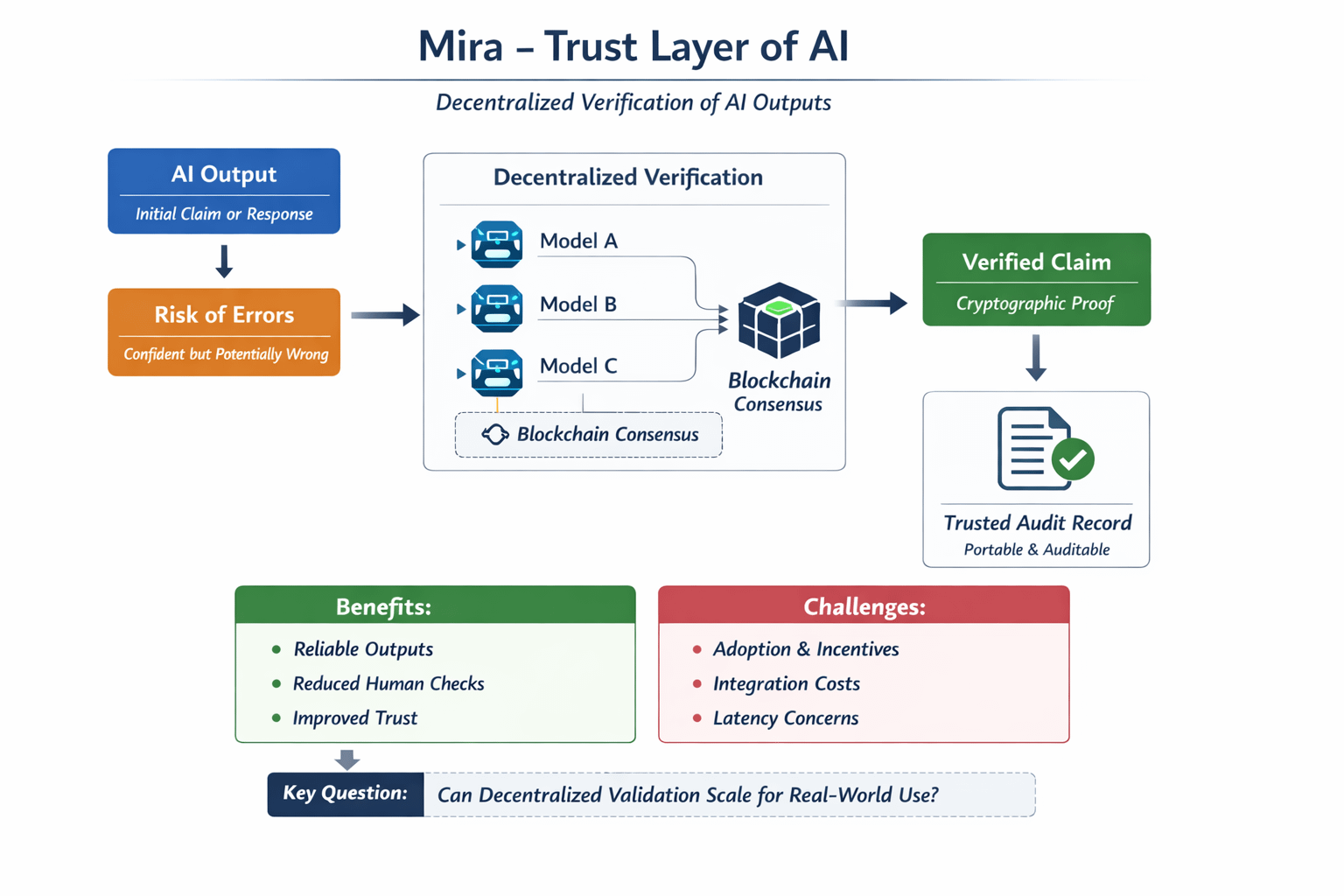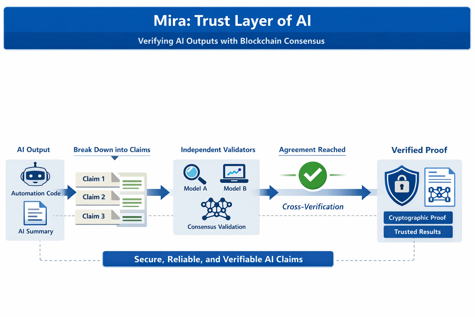 That is why I have been watching @Mira - Trust Layer of AI with interest. The idea as I understand it is to take AI outputs and turn them into verifiable claims that are validated by multiple independent models through a blockchain consensus mechanism. In other words the network breaks down complex content into smaller claims and seeks agreement across independent validators before attaching a cryptographic proof.