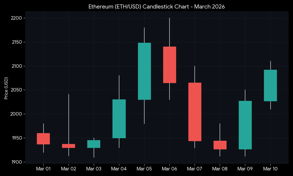 Ethereum (ETH) is currently at a critical crossroads as of March 10, 2026. After a turbulent start to the month influenced by geopolitical tensions and large-scale "whale" selling, the price has recently clawed back above the psychological $2,000 mark, currently trading around $2,092.