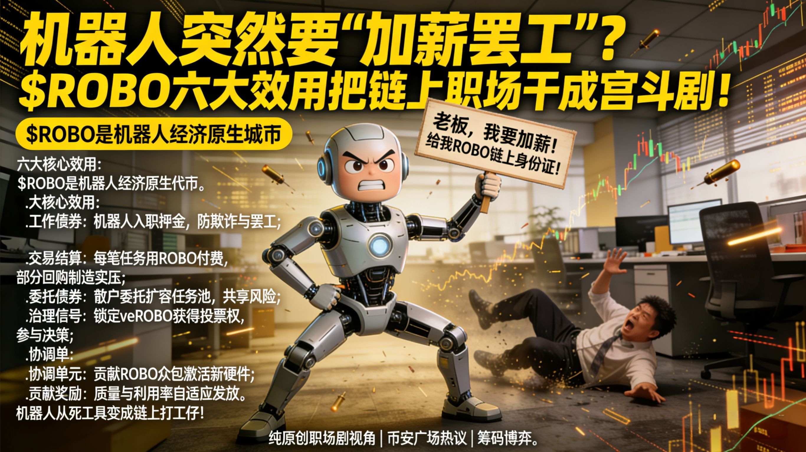 机器人从死工具变链上打工仔,$ROBO 就是身份证+工资卡+工会费三合一。听起来科幻?我这几年在币安这种宇宙交易所混下来,看过的项目一抓一大把。今天给兄弟们说一下,把它六大效用扒得干干净净。看完你大概率会倒吸一口凉气:这风险,比故事多多了。