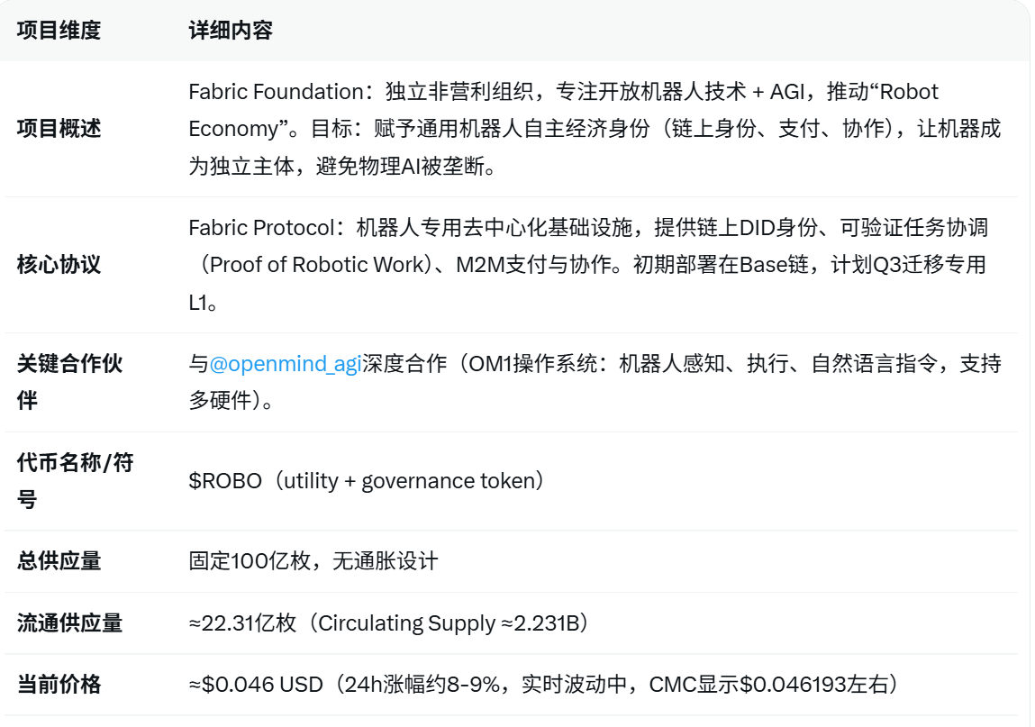 气是气,但冷静下来想想,这项目其实挺硬核的,不是纯薅羊毛游戏。$ROBO 现在价格0.046刀左右(CMC实时数据,24h涨了9%+),市值103M出头,流通22.3亿,FDV 4.6亿。