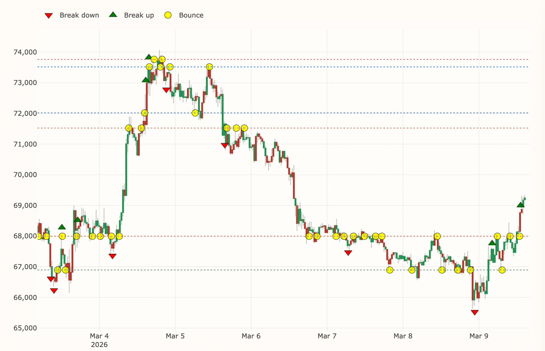 Ở phía trên, mốc 71.500 USD hiện đóng vai trò trần của kênh giá hiện tại. Khu vực này ghi nhận 6 lần tương tác, trong đó có 5 lần giá bị từ chối và chỉ một lần phá vỡ rõ ràng.