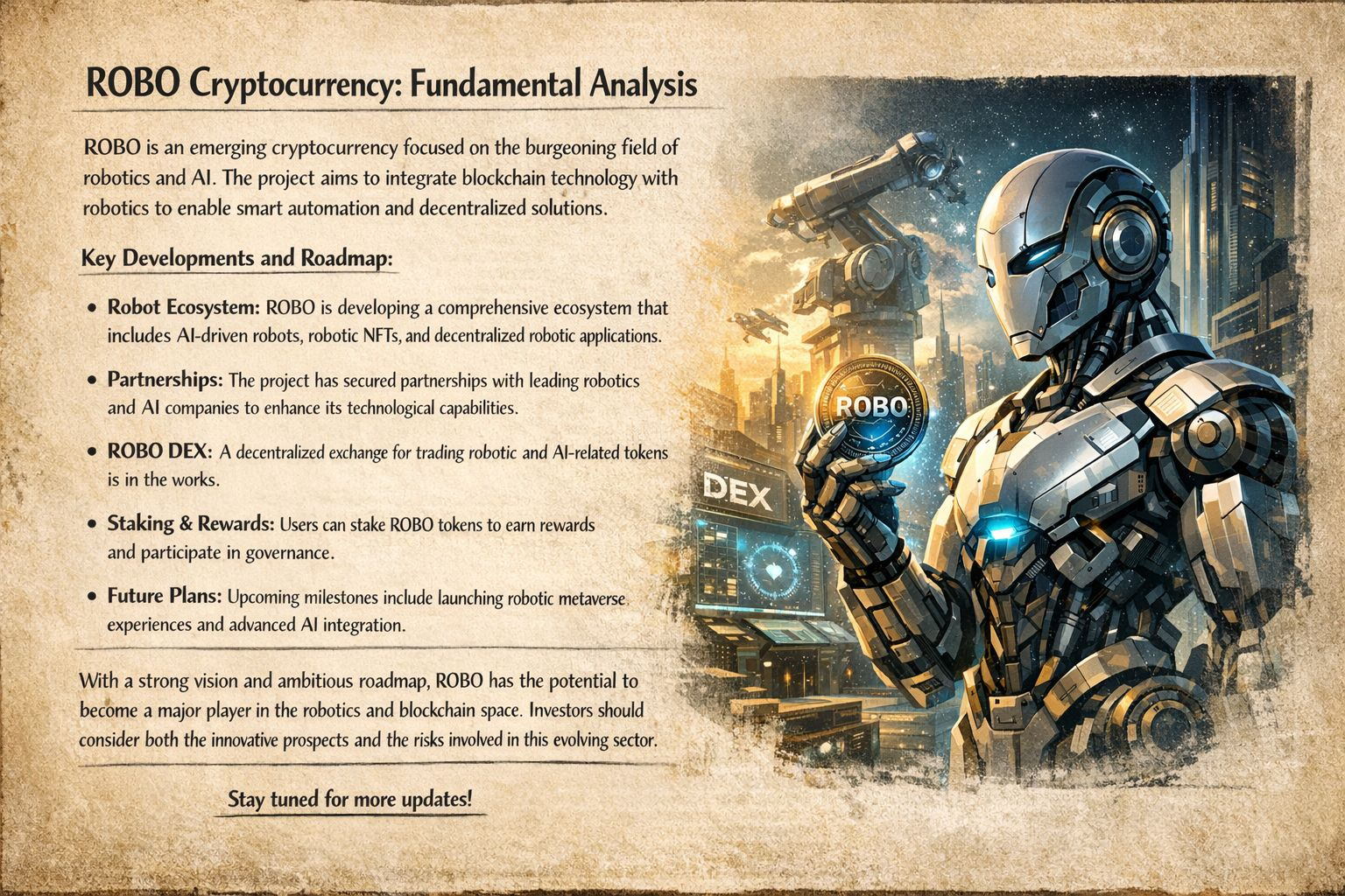 Overall, ROBO represents an ambitious project that aims to combine blockchain, robotics, and artificial intelligence into a single decentralized ecosystem. While the concept is innovative and has strong long-term potential, it remains an early-stage project. Its success will depend on technological development, adoption by robotics and AI industries, and the ability to build a strong developer and user community.