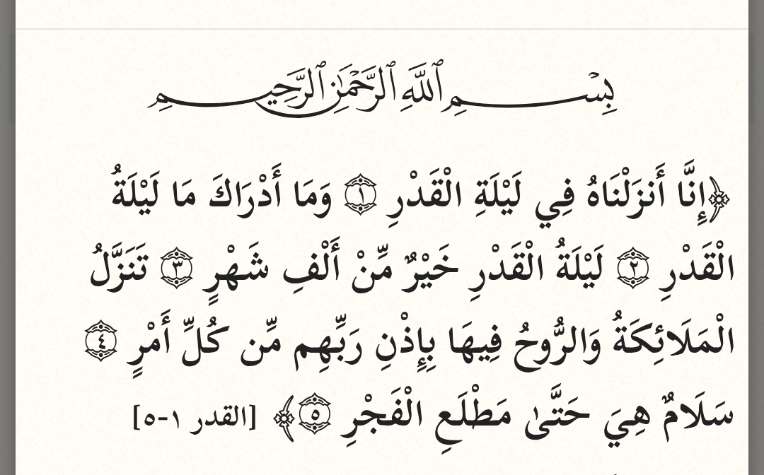 ﷽ ﴿إِنَّا أَنزَلْنَاهُ فِي لَيْلَةِ الْقَدْرِ ١ وَمَا أَدْرَاكَ مَا لَيْلَةُ الْقَدْرِ ٢ لَيْلَةُ الْقَدْرِ خَيْرٌ مِّنْ أَلْفِ شَهْرٍ ٣ تَنَزَّلُ الْمَلَائِكَةُ وَالرُّوحُ فِيهَا بِإِذْنِ رَبِّهِم مِّن كُلِّ أَمْرٍ ٤ سَلَامٌ هِيَ حَتَّىٰ مَطْلَعِ الْفَجْرِ ٥﴾ [القدر ١-٥]