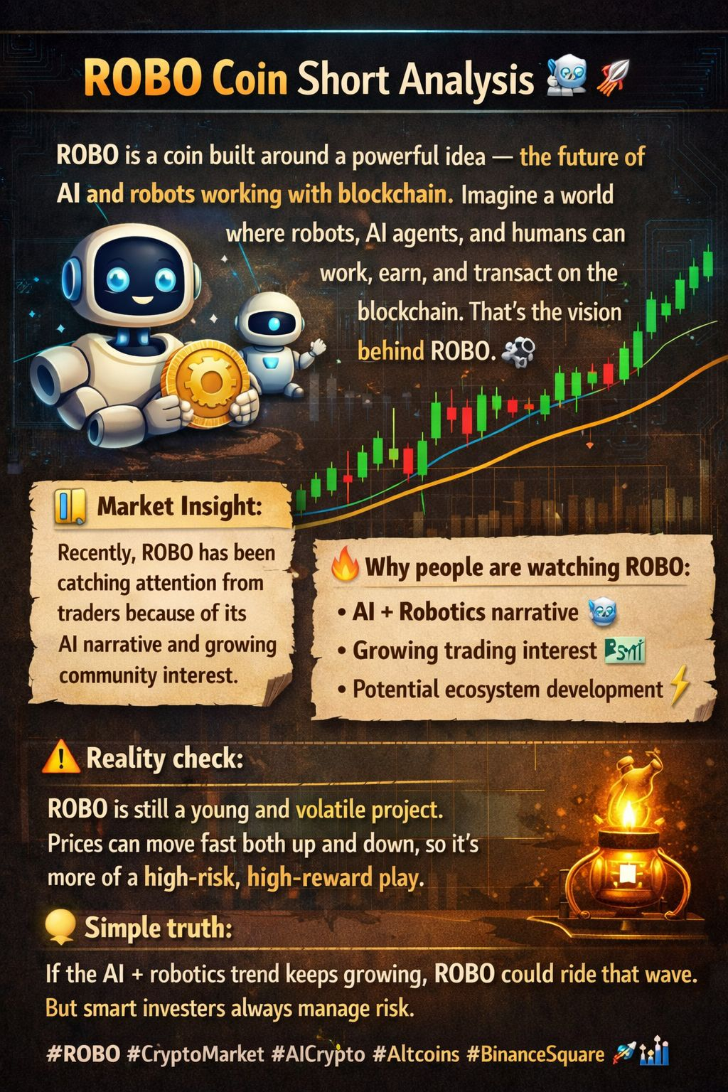 $ROBO Coin Short Analysis 🤖 is a coin built around a powerful idea — the future of AI and robots working with blockchain. Imagine a world where robots, AI agents, and humans can work, earn, and transact on the blockchain. That’s the vision behind @ROBO. ⚙️