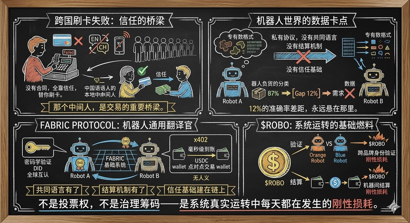 Fabric Protocol @Fabric Foundation 在做的,就是成为那个不需要人类的通用翻译官。它给每台机器人一个链上身份——不是某家厂商私有系统颁发的,是密码学验证的,全球互认。并通过x402协议打通结算层——A机器人和B机器人,直接用USDC点对点交易,毫秒级到账,不需要任何人类审批。共同语言有了,结算机制有了,信任基础建在链上——那笔被卡住的数据交易,第一次有了发生的可能。
