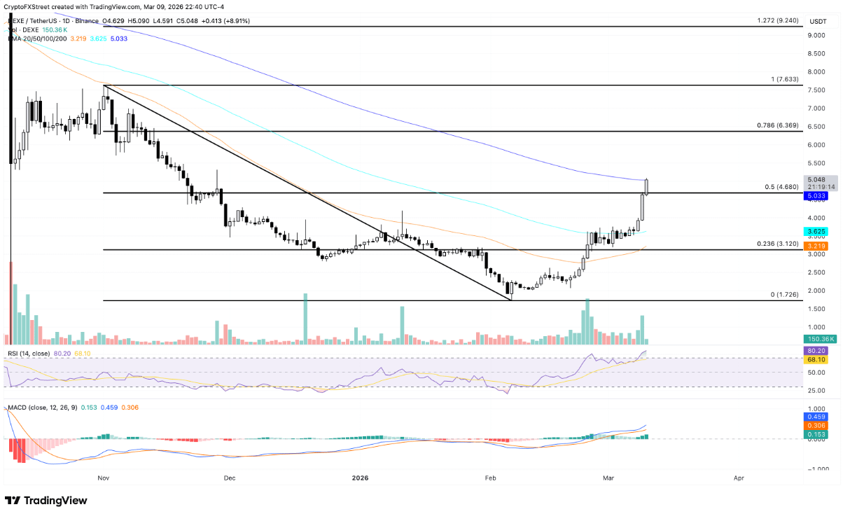 Ở chiều ngược lại, nếu xuất hiện nhịp điều chỉnh, DEXE có thể tìm thấy vùng hỗ trợ gần nhất tại mức Fibonacci 50% quanh 4,68 USD. Trường hợp áp lực bán gia tăng, vùng đệm quan trọng tiếp theo nằm tại đường EMA 100 ngày quanh 3,62 USD.