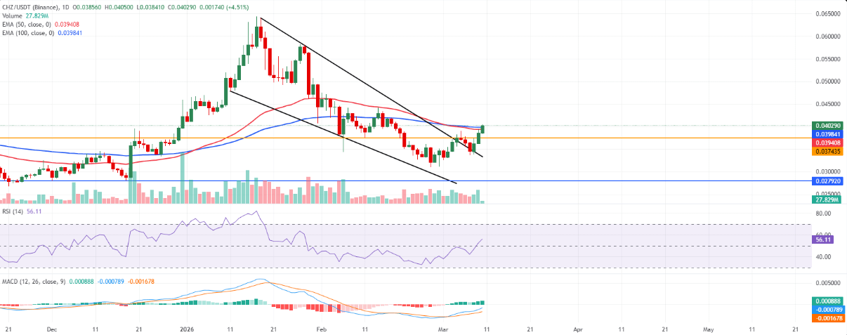 Giá Chiliz (CHZ) đang duy trì giao dịch trên mốc 0,040 USD vào thứ Ba, cho thấy tín hiệu phục hồi đáng chú ý sau giai đoạn suy yếu trước đó. Xu hướng ngắn hạn hiện nghiêng nhẹ về phía tăng khi giá vẫn giữ vững phía trên mô hình cái nêm giảm vừa được phá vỡ — một tín hiệu kỹ thuật thường báo hiệu khả năng đảo chiều tăng.