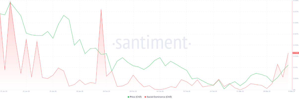 Ở góc độ dữ liệu xã hội, chỉ số Social Dominance từ Santiment cũng góp phần củng cố triển vọng tích cực. Chỉ số này đo lường tỷ lệ thảo luận về CHZ trên các kênh truyền thông tiền điện tử. Kể từ đầu tháng 3, Social Dominance đã duy trì xu hướng tăng ổn định và chạm mốc 0,016% vào thứ Ba – mức cao nhất kể từ đầu tháng 2. Diễn biến này cho thấy sự quan tâm của thị trường đối với CHZ đang dần gia tăng, đồng thời tâm lý nhà đầu tư cũng có dấu hiệu cải thiện rõ rệt.