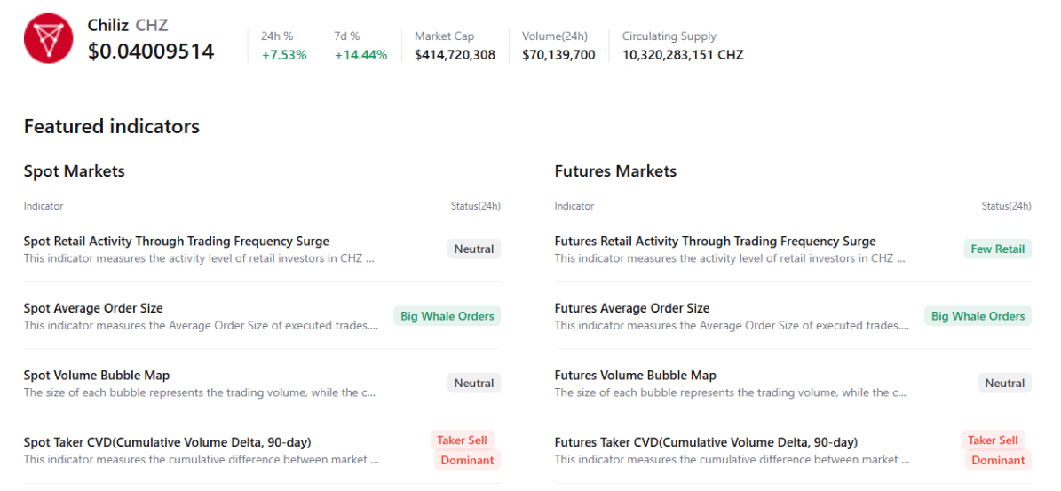 Dữ liệu tổng hợp từ CryptoQuant cho thấy bức tranh thị trường của Chiliz vẫn còn đan xen nhiều yếu tố trái chiều, nhưng những tín hiệu lạc quan ban đầu đã bắt đầu xuất hiện. Đáng chú ý, sự gia tăng của các lệnh mua quy mô lớn từ nhóm cá voi trong bối cảnh dòng tiền nhà đầu tư nhỏ lẻ vẫn khá dè dặt đang tạo ra một nghiêng nhẹ về kịch bản tích cực cho CHZ. Tuy vậy, hoạt động giao dịch trên cả thị trường spot lẫn futures vẫn cho thấy lực bán đang chiếm ưu thế, phản ánh tâm lý thận trọng vẫn bao trùm phần lớn nhà đầu tư.