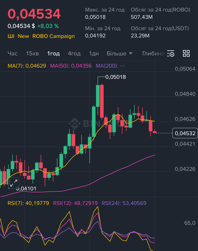 На даний момент ціна ROBO становить приблизно 0.04534 USDT. Протягом останніх 24 годин монета досягла максимуму 0.05018, а мінімум був на рівні 0.04192. Після різкого зростання до локального максимуму ринок перейшов у фазу корекції та консолідації. Це типовий сценарій після сильного імпульсного руху, коли трейдери фіксують прибуток, а ціна стабілізується перед наступним потенційним рухом.