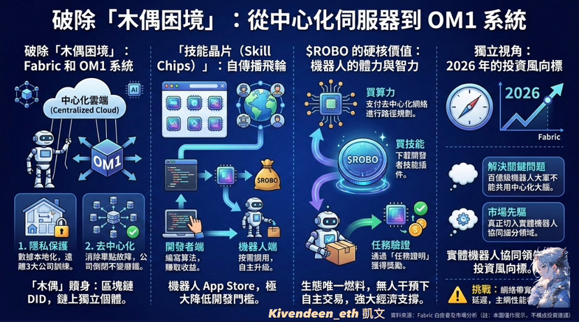 但 Fabric 提出的 OM1 系統,本質上是想給機器人一個去中心化的靈魂。試著想像一下,透過區塊鏈的身份技術,機器人將能成為一個獨立的數位個體。屆時機器人的數據歸你,而它的命運也不會因為哪家公司倒閉就完蛋。