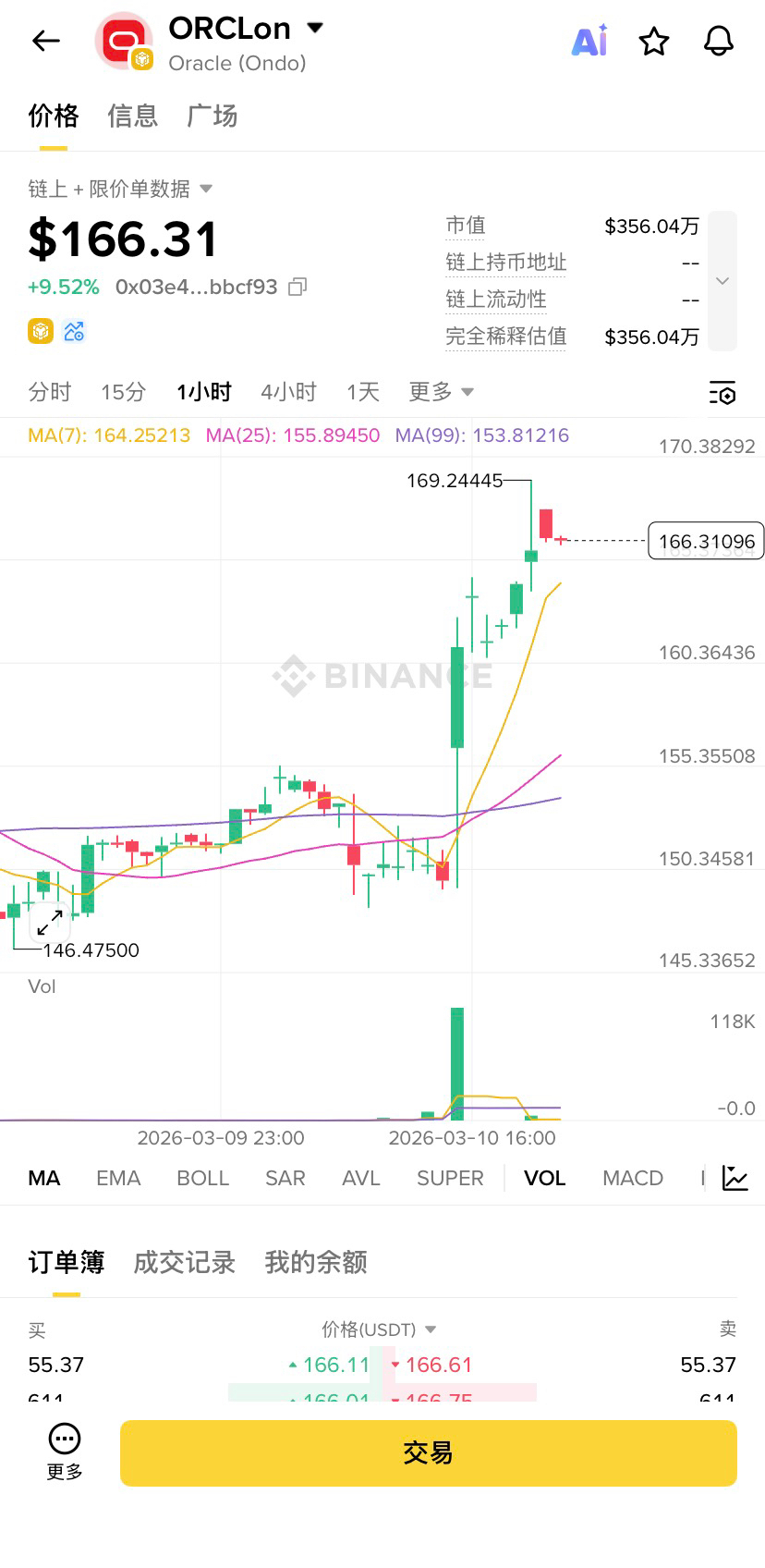 作为 RWA 赛道的先锋,Hyperliquid 上的 ORCL 映射合约几乎同步开启了暴走模式。价格瞬间从149美元跳涨至 167.4美元 附近。最魔幻的是,加密玩家的疯狂博弈甚至让该合约较现货出现了巨大的溢价,这种“跨次元”的流动性挤压,成了空头的噩梦。