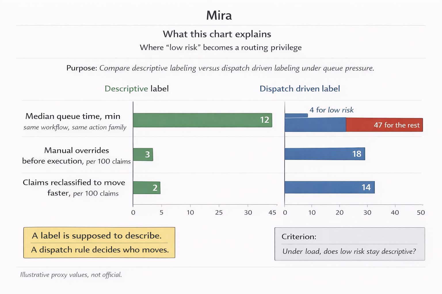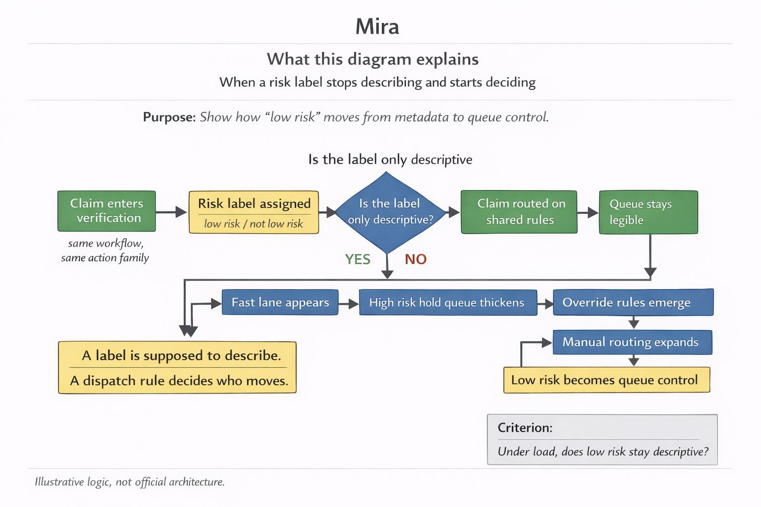 The useful test is simple. When Mira is busy, does low risk still describe the claim, or does it quietly decide who moves first. Do override rules stay rare, or do they become the bridge between labels and action. Do similar claims with similar consequences move through the system on similar terms, or does 1 neutral sounding tag keep deciding whose time matters.