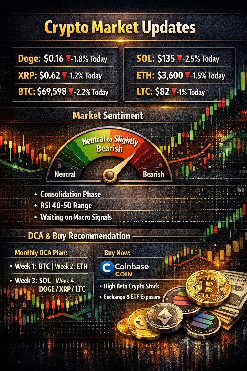Outlook: consolidation $65K–$75K; ETF inflows and macro liquidity remain drivers.SOL: ~$135 (📉) ~-2.5% Today; ~-6% This Week.