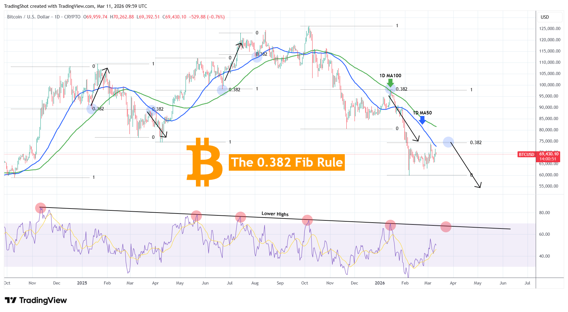 Even since the star of the current Bear Cycle we are seeing this with the market already making a January 14 2026 rebound on the 0.382 and getting rejected to a new Bearish Leg. That rejection was also on the 1D MA100 (green trend-line), which is currently serving as the Bear Cycle's medium-term Resistance.