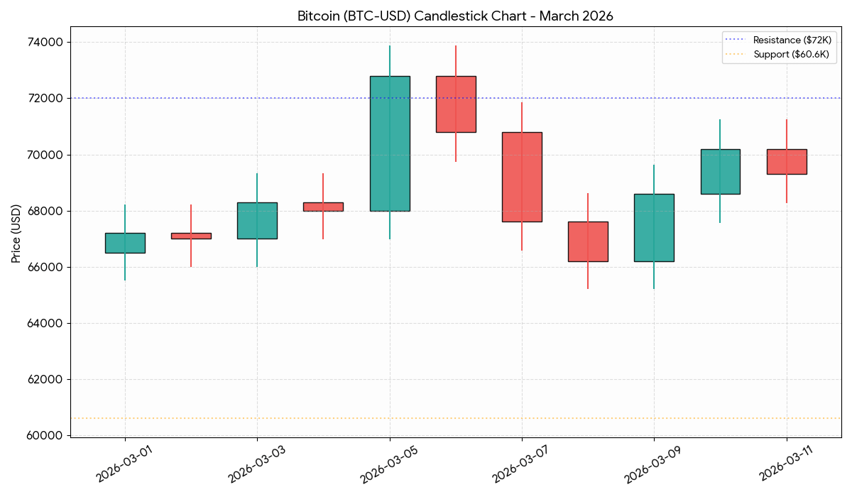 The $72K Resistance Exit: * Context: Bitcoin has repeatedly failed to hold above $72,000 in early March.