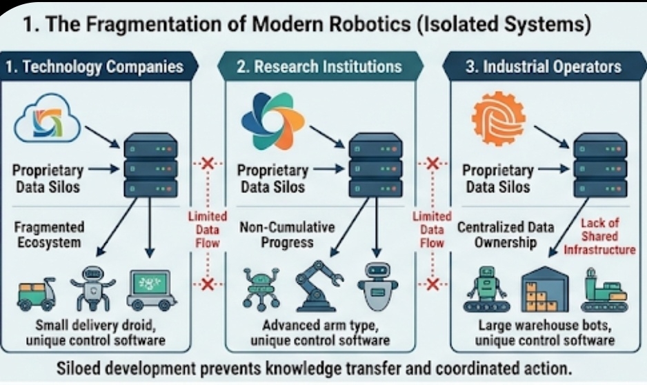 This fragmentation creates practical limitations. A robot trained in one environment may not easily transfer knowledge to another. Operational data collected by companies is often stored privately, preventing other developers from learning from those experiences. As a result, progress in robotics can become isolated rather than cumulative.