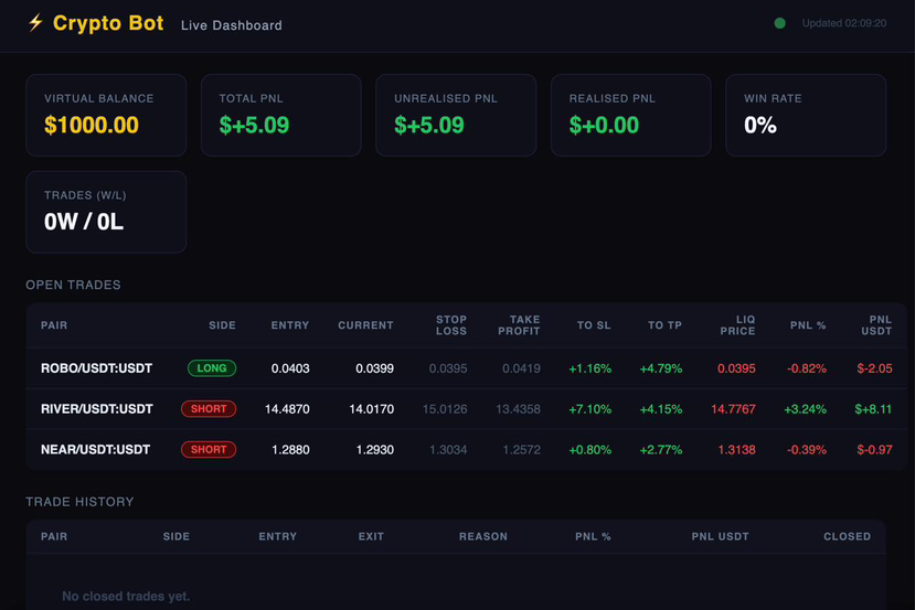 📱 Real-time Dashboard Built a live web dashboard that shows open trades, PnL, win rate, liquidation prices and full trade history. Updates every 5 seconds.