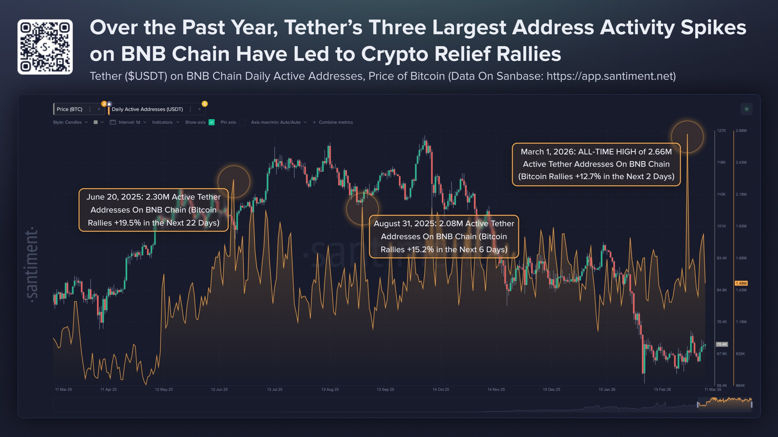 🔸 Dữ liệu trong một năm qua chỉ ra rằng, cả 3 lần số lượng địa chỉ hoạt động của USDT trên BNB Chain đạt đỉnh đều là bệ phóng kích hoạt các nhịp phục hồi mạnh mẽ cho Bitcoin. Các mốc tháng 6/2025 và tháng 8/2025 là minh chứng điển hình. Gần đây nhất, ngày 1/3/2026 đã thiết lập đỉnh kỷ lục mới với 2,66 triệu địa chỉ hoạt động, ngay lập tức tạo đà cho nhịp bứt phá 12,7% của BTC chỉ trong vỏn vẹn 2 ngày.