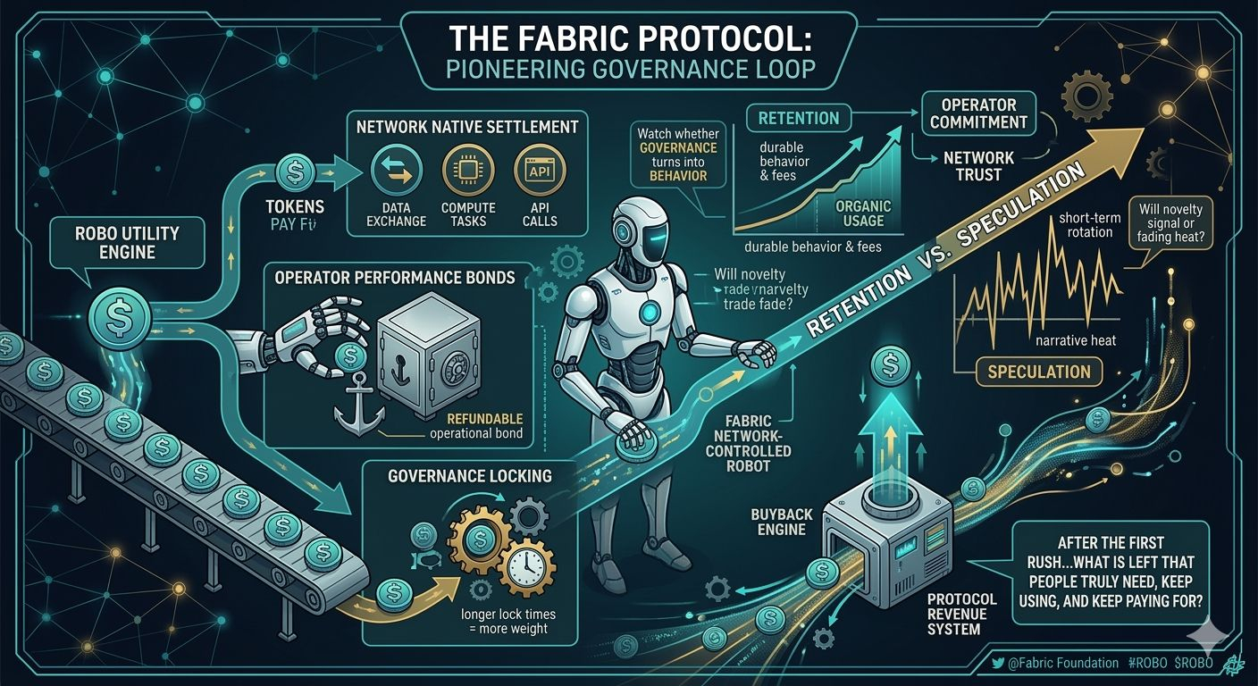 Fabric requires robot operators to post refundable performance bonds in the native token just to register hardware and provide services. The protocol also enforces native settlement across data exchanges, compute tasks, and API calls. Add in a time-weighted governance locking mechanism—where longer locks equal more weight—and a proposed system where protocol revenue drives token buybacks, and you see the blueprint. In plain English: the architecture is attempting to manufacture demand through actual network capacity and operator accountability, rather than relying entirely on speculative trading.