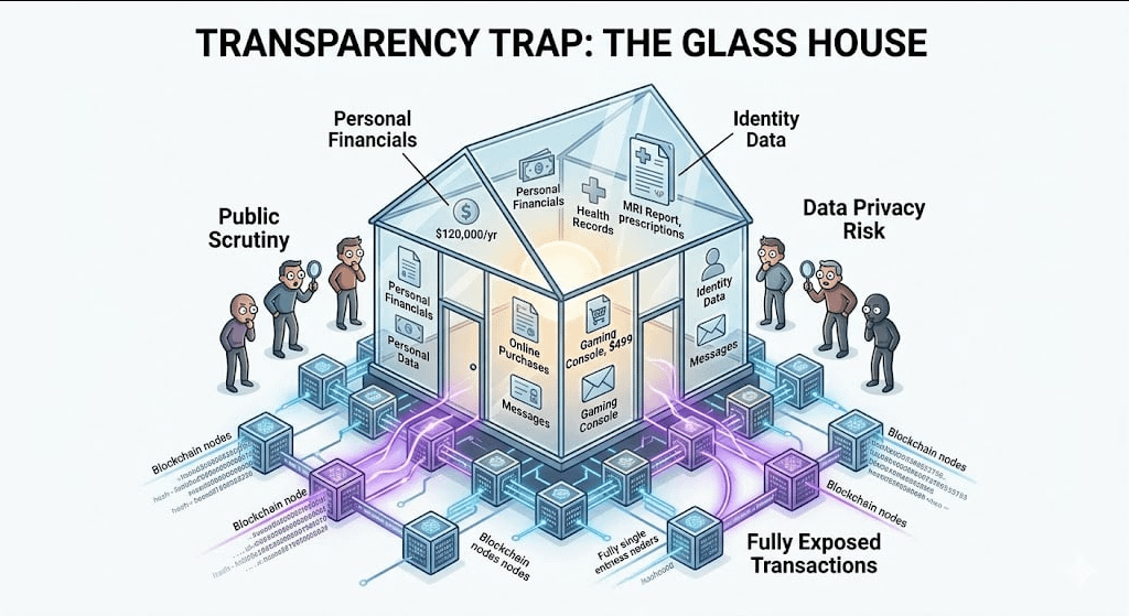 I can easily visualize what a glass house would look like— with my walls transparent, my salary, medical history, and even my recent Amazon purchases are now visible to my neighbors. It’s unnerving. The essay explains this is how blockchains work today and I like how the author used a glass house metaphor to give me that perspective. It’s common to hear a Bitcoin maximalists describe the value of 'transparency', but as a metaphor, this is a nightmare.