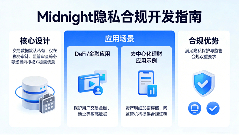 开发指南里的方案给我最直观感受就是它踩准了隐私赛道的合规风口。Midnight的核心设计是交易数据默认私有,仅在税务审计、监管审查等必要场景向授权方披露信息,开发者按指南搭建的DeFi或金融应用,能在保护用户交易金额、地址等敏感数据的同时,满足合规要求。比如开发一款去中心化理财应用,既可以让用户的资产明细加密存储,又能向监管机构提供合规证明,这是门罗币这类纯匿名公链做不到的,也让应用能顺利对接企业和机构用户。