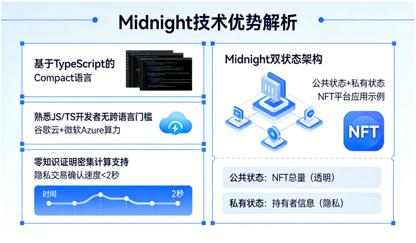 技术层面的优势也很突出,指南里会指导开发者用基于TypeScript的Compact语言写智能合约,熟悉JS/TS的开发者几乎不用跨语言门槛,还能借助谷歌云、微软Azure的算力完成零知识证明的密集计算,让隐私交易的确认速度缩短到2秒内。同时Midnight的双状态架构,让开发者能灵活设计公私有数据的存储逻辑,比如开发NFT平台时,可将NFT总量设为公共状态保证透明,把持有者信息设为私有状态保护隐私,兼顾了网络可信度和用户隐私。