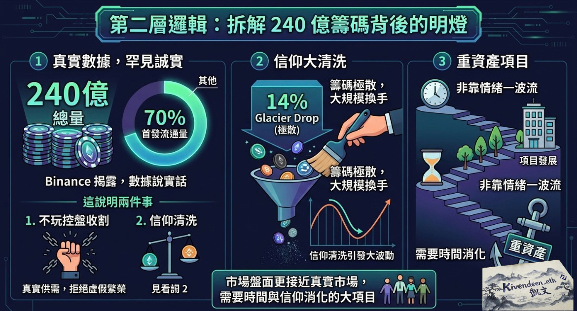 說實話,絕對不只有我被 240 億的總量嚇到,但我們得看數據說實話。Binance 揭露的首發流通量直接給到近 70%,這在目前的幣圈是非常罕見的誠實。這也說明了兩件事:
