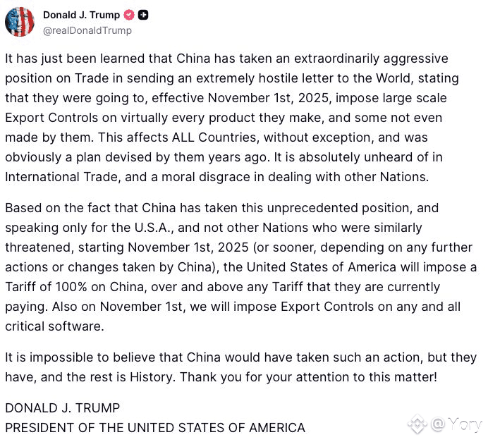 ماكرو: إعلان رسوم بنسبة 100% على الصين يعني تضخم “سيئ” وضبابية في سياسة الفيدرالي. المستثمرون هرعوا نحو الأصول الآمنة — الدولار، السندات القصيرة، والذهب.
