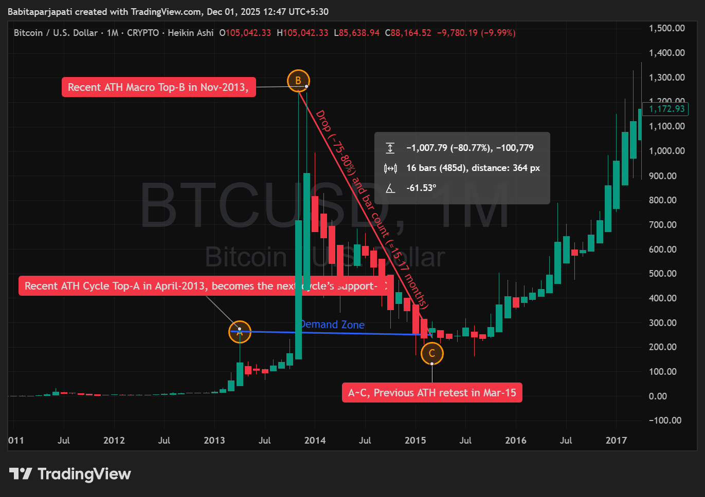 Ciclo-1: 2013 ATH → crollo dell'80% → ricalcolo