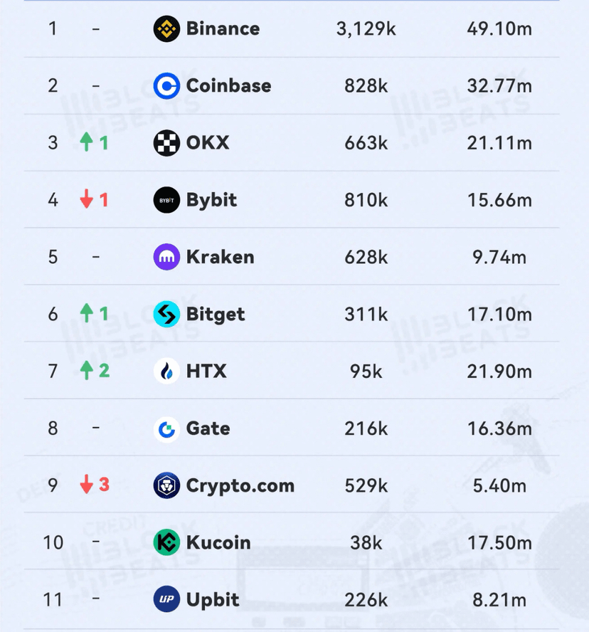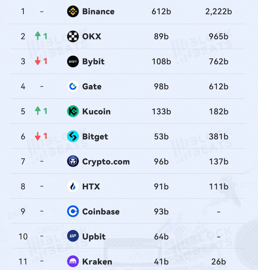 A novembre 2025, il volume degli scambi spot delle CEX dominanti è diminuito del 27% rispetto ad ottobre. I tre principali ribassi sono stati Coinbase -5,42%, Kucoin -16,50% e Crypto.com -17,72%. Gli ultimi tre sono stati OKX -27,18%, Bybit -31,42% e Gate -43,91%.