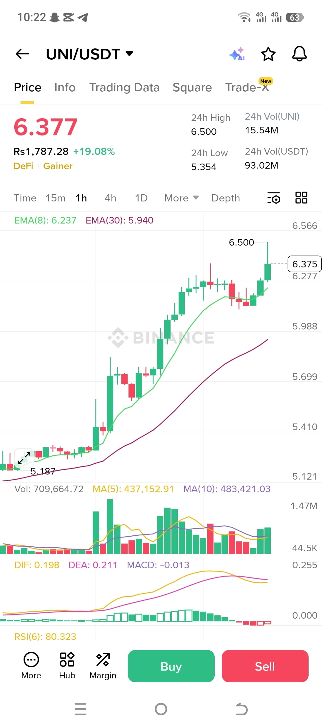 RSI(6): ~80 → ipercomprato (ritracciamento a breve termine possibile)