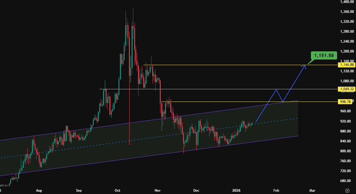 BNB ha attraversato una fase correttiva sui time frame più elevati dopo il forte rialzo iniziale del ciclo. Sul grafico settimanale, l'azione del prezzo mostra che BNB rispetta ancora la sua struttura ascendente più ampia, scambiando all'interno di un canale ascendente a lungo termine. Il recente ritracciamento sembra essere un ritracciamento sano piuttosto che un'inversione di tendenza, poiché gli acquirenti continuano a difendere le zone tecniche chiave. La fascia dei $1.000–$1.050 si distingue come una resistenza intermedia importante, mentre la zona dei $998 si allinea strettamente con la linea mediana del canale, agendo come pivot critico per la direzione a breve e medio termine.