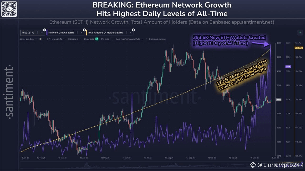 Secondo i dati on-chain di Santiment, Ethereum sta vivendo una delle fasi di espansione della rete più forti della sua storia. Nell'ultima settimana, in media, sono stati creati 327.100 nuovi portafogli ETH ogni giorno, evidenziando un forte aumento nell'adozione degli utenti e nell'attività on-chain. Notabilmente, domenica è stata registrata la creazione di 393.600 nuovi portafogli, segnando il più alto numero di creazione di portafogli in un solo giorno mai registrato sulla rete Ethereum.