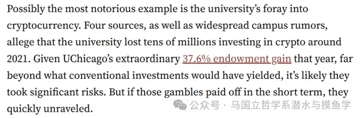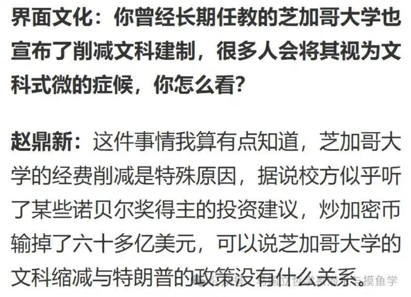 Recentemente, ho colto l'occasione offerta dalle notizie di Jimiann per pubblicare "Lezioni sulla società e sui movimenti politici" del professor Zhao Dingxin (la seconda edizione di questo libro è davvero buona) per intervistare il professor Zhao. Nell'intervista, il professor Zhao ha detto che i recenti tagli al budget dell'Università di Chicago erano dovuti al fatto che "si dice che la scuola sembri aver seguito i consigli di investimento di alcuni vincitori del Premio Nobel, e ha investito in criptovalute, perdendo oltre sei miliardi di dollari. Si può affermare che il taglio dell'Università di Chicago alle arti liberali non ha nulla a che fare con le politiche di Trump."