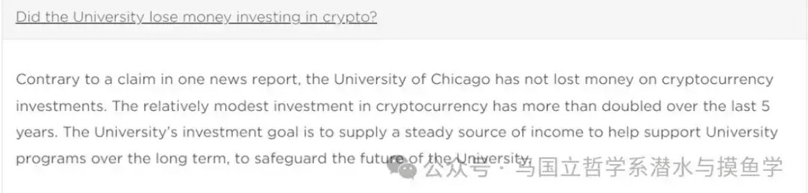 Per coincidenza, nelle FAQ aggiornate dall'Università di Chicago a dicembre 2025, è stata menzionata la questione del trading di criptovalute. Secondo il sito ufficiale: "Contrariamente a quanto affermato in un rapporto di notizie, l'Università di Chicago non ha subito perdite negli investimenti in criptovalute. L'investimento della nostra scuola in criptovalute è relativamente piccolo ma è più che raddoppiato negli ultimi cinque anni. Il nostro obiettivo di investimento è fornire una fonte stabile di reddito per sostenere i vari progetti della nostra scuola a lungo termine e garantire il futuro della nostra scuola."