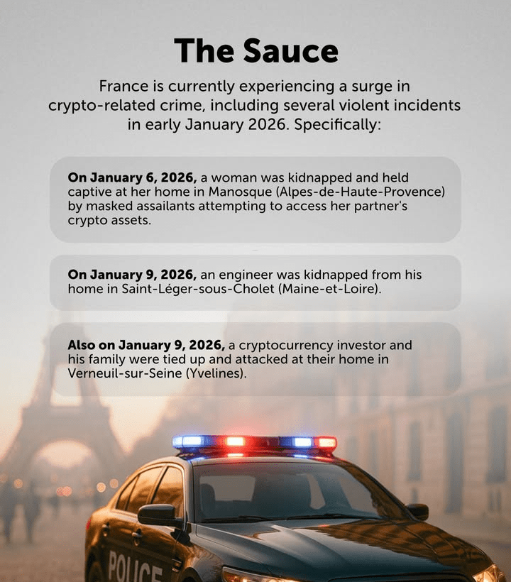 La Francia ha visto un aumento dei crimini legati alle criptovalute a seguito di diversi incidenti violenti all'inizio di gennaio 2026. Tra il 6 e il 9 gennaio, tre tentativi di rapimento separati hanno preso di mira persone collegate alle criptovalute, inclusa una donna tenuta prigioniera a Manosque, un ingegnere prelevato dalla sua casa nel Maine et Loire, e un investitore in criptovalute e la sua famiglia attaccati a Yvelines.