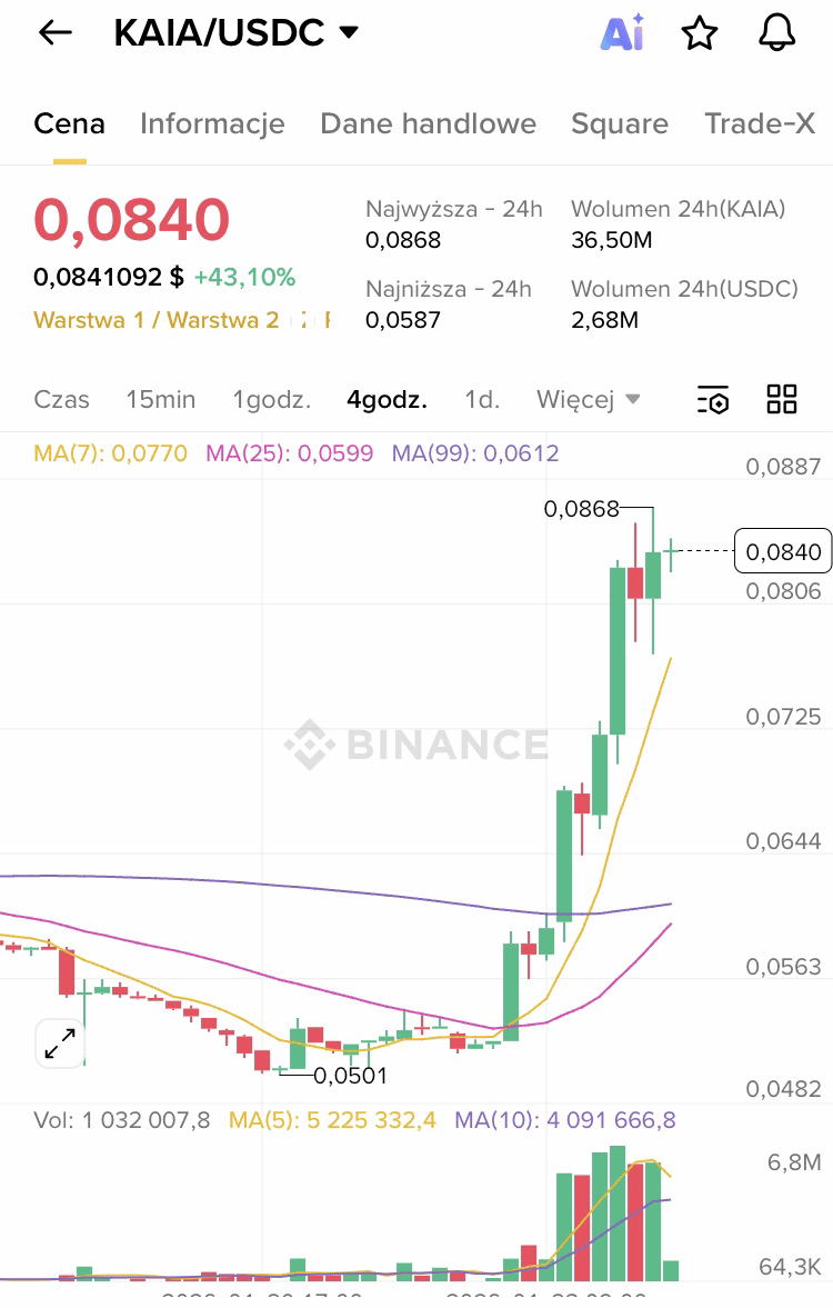 Negli ultimi 24 ore, la criptovaluta KAIA ha mostrato una forte attività di trading e un significativo aumento del prezzo. Secondo i dati di mercato in tempo reale, il prezzo di KAIA è recentemente aumentato di circa il ~40% nell'ultimo giorno, negoziando intorno a $0.08–$0.085 sui principali aggregatori, con un intervallo di 24 ore compreso tra $0.057 e $0.085.