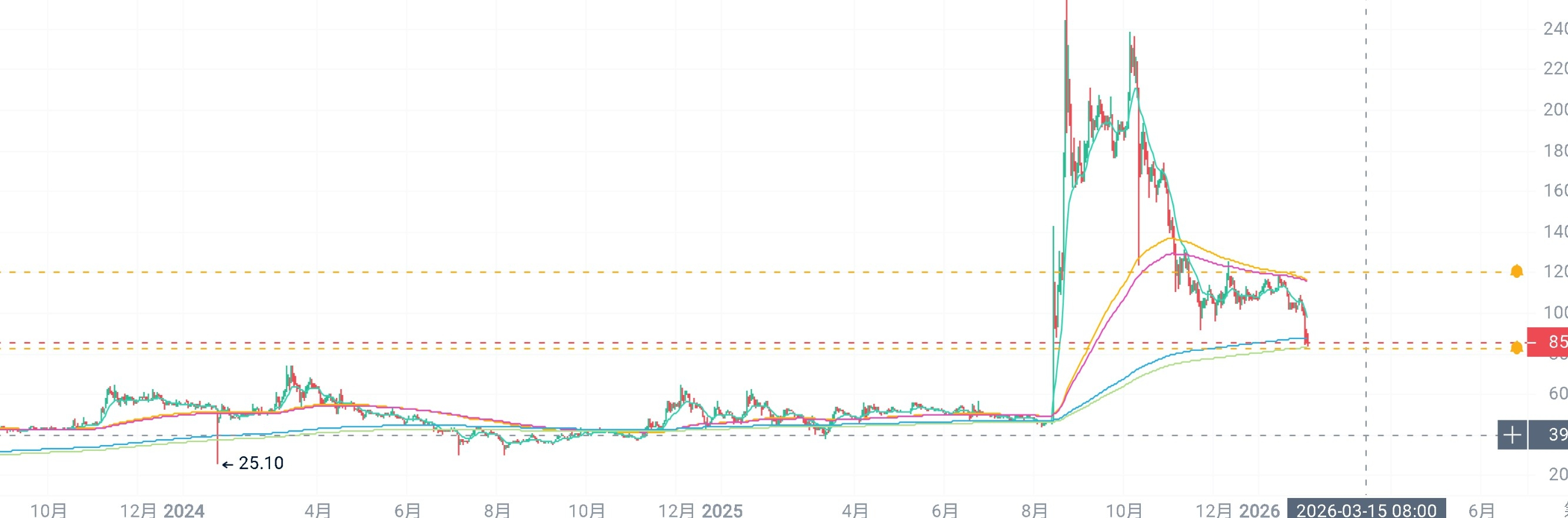 7.OKB: Criptovaluta della piattaforma, la media del ciclo precedente era di circa 27, il valore minimo prima di un forte aumento in questo ciclo era di circa 30, distrutti 3/4, quindi circa tre volte, il prezzo reale medio è di circa 81-90, ed è attualmente vicino alla linea EMA di 600 giorni. (Come nel grafico giornaliero di OKB alla fine del documento)