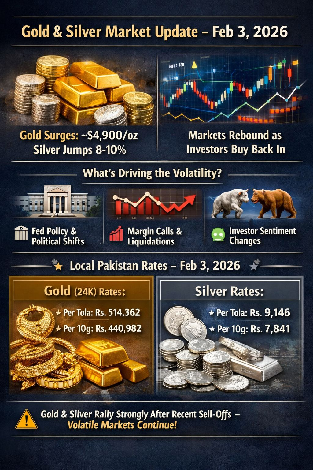 I mercati dell'oro e dell'argento rimangono in una fase altamente turbolenta — contrassegnata da oscillazioni estreme e cambiamenti rapidi nel sentiment degli investitori. Dopo recenti crolli storici dai massimi record, entrambi i metalli sono rimbalzati fortemente oggi, guidati da ricerca di affari, reazioni macroeconomiche e aspettative di mercato in cambiamento. I mercati locali — incluso il Pakistan — stanno rispecchiando questa volatilità, con i prezzi che risalgono dopo forti perdite precedenti.