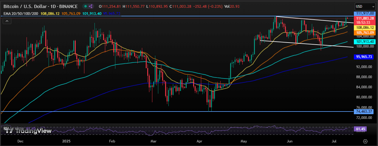 Na podstawie dziennego wykresu, po długiej konsolidacji, wczoraj wzór został przełamany i osiągnął nowy rekord. Po tygodniach konsolidacji między zakresem 101 000 a 111 000 USD, BTC przełamał górną linię trendu, sugerując możliwość kontynuacji wzrostu. 20-dniowe i 50-dniowe EMA (obecnie około 108 086 USD i 105 763 USD odpowiednio) są nachylone w górę i oferują dynamiczne wsparcie, podczas gdy RSI pozostaje silny na poziomie 61,45 — tuż poniżej strefy wykupu, wskazując na zdrowy momentum.